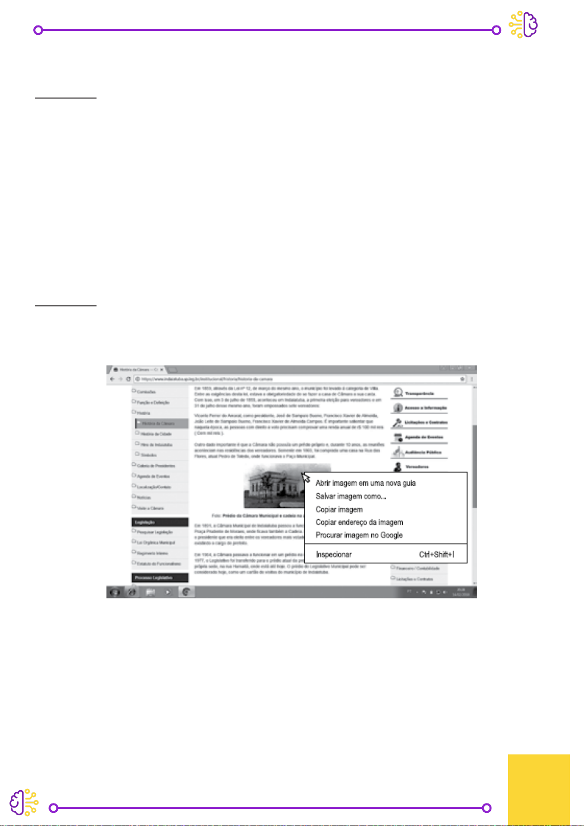 111 GOOGLE CHROME Questão 279: CESPE - Esc Pol (PC MA)/PC MA/2018 Ao se clicar com o botão direito do mouse sobre uma guia do programa de navegação Google Chrome, em sua versão mais recente, contendo determinada página da Internet, e selecionar a opção Fixar guia, na lista exibida, será possível a) criar um ícone no canto superior esquerdo do navegador, o qual permitirá o acesso direto à página exibida. b) criar na área de trabalho do computador um ícone de atalho, o qual, ao ser selecionado, abrirá a página exibida. c) transformar a guia do navegador em uma nova janela. d) adicionar a página exibida pela guia à lista de páginas favoritas. e) duplicar a guia aberta, criando-se, assim, uma cópia da página exibida. Questão 280: VUNESP - CI (CM Indaiatuba)/CM Indaiatuba/2018 Observe a imagem do Google Chrome (Versão 64.0.3282.167), em sua configuração padrão. Para salvar a foto apresentada no portal como um arquivo local, usando apenas o navegador, o usuário pode clicar com o botão secundário do mouse, geralmente o botão direito, e clicar na opção a) Salvar imagem como... b) Copiar endereço da imagem. c) Abrir imagem em uma nova guia. d) Copiar imagem. e) Inspecionar. Licenciado para - sara aparecida de souza consoli - 33544593874 - Protegido por Eduzz.com