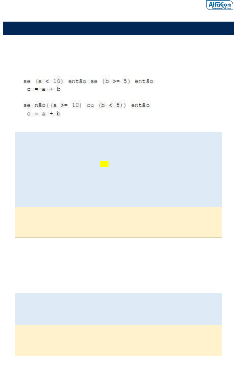 alfaconcursos.com.br MUDE SUA VIDA! 8 QUESTÕES COMENTADAS 1. ANO: 2011 Banca: CESPE/CEBRASPE Órgão: TJ-ES Prova: Analista Considerando-se os operadores empregados para expressar as funções lógicas de negação conjunção e disjunção é correto afirmar que os dois trechos de algoritmo apresentados a seguir são equivalentes. Certo ( x ) Errado ( ) SOLUÇÃO RÁPIDA Na primeira expressão há duas condições, se a for menor que 10 e b maior ou igual a 5, então c recebe a soma entre a e b. Na segunda se verifica se a não é maior ou igual a 10 (ou seja, se a é menor do que 10) ou se b não é menor que 5 (ou seja, maior ou igual a 5), então c recebe a soma entre a e b. Vejam que as duas estão escritas de forma diferente, mas possuem o mesmo resultado. SOLUÇÃO COMPLETA Seguindo a aplicação da lei De Morgan, há equivalência, pois, há uma dupla negação na segunda expressão. 2. ANO: 2011 Banca: CESPE/CEBRASPE Órgão: TJ-ES Prova: Técnico O operador lógico de disjunção (ou) é útil em tipos de análise para verificar se todos os valores são verdadeiros, o que, consequentemente, acarretará em todos os resultados serem também verdadeiros. Certo ( ) Errado ( x ) SOLUÇÃO RÁPIDA Errado pois, para verificar se todas as opções são verdadeiras deveria utilizar o operador e. SOLUÇÃO COMPLETA Essa é uma questão que traz conceitos de raciocínio lógico aplicados em lógica de programação de software. https://www.alfaconcursos.com.br/
