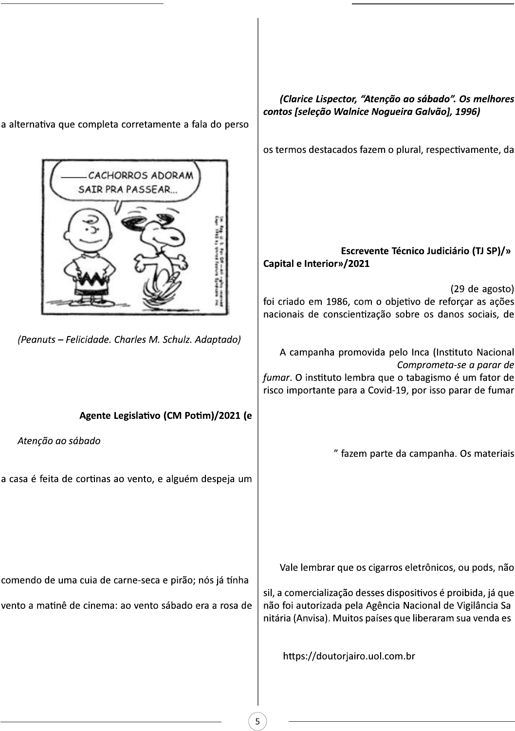 LÍNGUA PORTUGUESA (A) um (B) uns (C) uma (D) umas 14. VUNESP - Auxiliar (Pref Cananéia)/Serviços Ge- rais/2020 Para responder à questão, assinale, em cada questão, - nagem dos quadrinhos. (A) O (B) Os (C) (A) (D) As 15. VUNESP - mais 1 concurso) Acho que sábado é a rosa da semana; sábado de tarde balde de água no terraço: sábado ao vento é a rosa da se- mana; sábado de manhã, a abelha no quintal, e o vento: uma picada, o rosto inchado, sangue e mel, aguilhão em mim perdido: outras abelhas farejarão e no outro sábado de manhã vou ver se o quintal vai estar cheio de abelhas. No sábado é que as formigas subiam pela pedra. Foi num sábado que vi um homem sentado na sombra da calçada - mos tomado banho. De tarde a campainha inaugurava ao nossa semana. Se chovia só eu sabia que era sábado; uma rosa molhada, não? No Rio de Janeiro, quando se pensa que a semana vai morrer, com grande esforço metálico a semana se abre em rosa: o carro freia de súbito e, de súbi- to, antes do vento espantado poder recomeçar, vejo que é sábado de tarde. Tem sido sábado, mas já não me perguntam mais. En- tão eu não digo nada, aparentemente submissa. Mas já peguei as minhas coisas e fui para domingo de manhã. Domingo de manhã também é a rosa da semana. Não é propriamente rosa que eu quero dizer. Na passagem –... vi um homem sentado na sombra da calçada comendo de uma cuia de carne-seca e pirão... –, mesma forma que: (A) guarda-roupa; cidadão. (B) vice-campeão; capitão. (C) boia-fria; mamão. (D) reco-reco; capelão. (E) pé-de-cabra; sensação. 16. VUNESP - - Leia o texto para responder à questão abaixo. O Dia Nacional de Combate ao Fumo saúde, econômicos e ambientais causados pelo tabaco. de Câncer) este ano chama-se se torna uma medida de proteção à saúde de todos os ci- dadãos. Peças criadas para redes sociais com a frase “Cringe mesmo é fumar desenvolvidos pelo Ministério da Saúde, em parceria com a Organização Pan-Americana de Saúde, destacam a im- portância de proteger a saúde de crianças, jovens e ado- lescentes, que são alvo de estratégias de venda para que possam se tornar um mercado repositor de novos consu- midores, já que o consumo de tabaco mata mais da meta- de de seus usuários. são opções mais saudáveis ao cigarro tradicional. No Bra- - - tão revendo as suas posições depois de novas orientações da Organização Mundial da Saúde (OMS). ( )