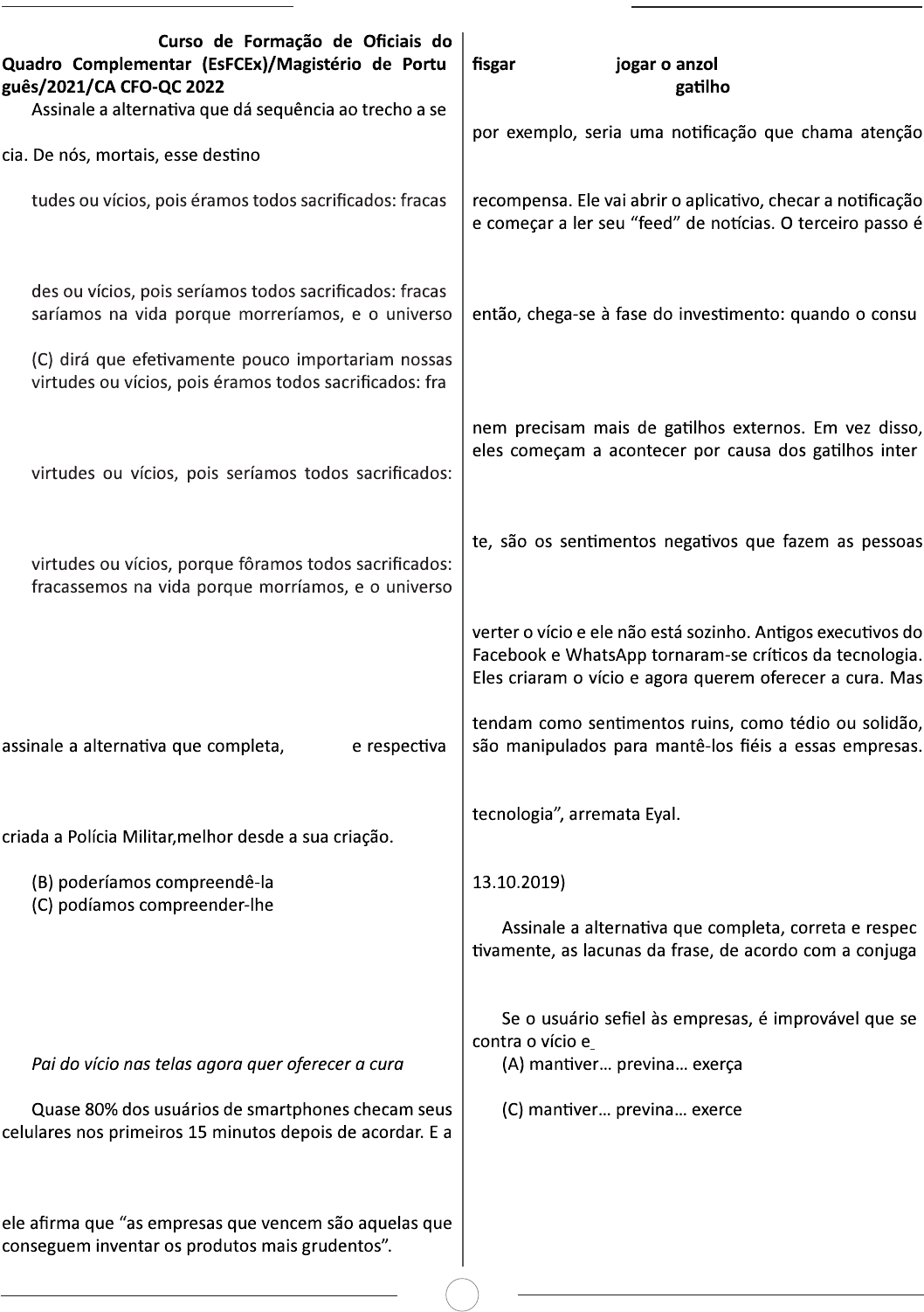 LÍNGUA PORTUGUESA 27 56. VUNESP - - - guir, preservando a correlação verbal e a lógica da sequên- (A) dizia que certamente pouco importem nossas vir- - samos na vida porque morreremos, e o universo nos será indiferente. (B) diria que talvez pouco importassem nossas virtu- - nos seria indiferente. - cassemos na vida porque morremos, e o universo nos será indiferente. (D) disse que seguramente pouco importassem nossas fracassaremos na vida porque morremos, e o universo nos era indiferente. (E) dissera que provavelmente pouco importem nossas nos fosse indiferente. 57. VUNESP - Cabo da Polícia Militar do Estado de São Paulo/Graduação/2020 Considerando a correspondência entre as formas ver- bais e o emprego do pronome, conforme a norma-padrão, correta - mente, as lacunas da frase. Se soubéssemos mais detalhes a respeito de como foi (A) podemos compreender-lhe (D) pudemos compreendê-la 58. VUNESP - Analista de Gestão (FITO)/Bibliote- ca/2020 (e mais 5 concursos) Leia o texto para responder a questão. tendência é só piorar, diz Nir Eyal, professor de Stanford e consultor especializado em ajudar empresas de tecnolo- gia a tornar seus produtos mais viciantes. Nesse mercado, Eyal esclarece que as empresas criaram o processo de pessoas, de , acionando quatro passos básicos. Começa com um , algo que diz ao usuário o que fazer, podendo ser externo ou interno. No Facebook, para o que está acontecendo na rede. Isso leva ao segun- do passo, a ação, algo que o usuário faz em busca de uma a recompensa variável. O psicólogo americano B.F. Skin- ner mostrou que, quando uma recompensa é dada sem que possa ser prevista, a ação se torna mais frequente. E, - midor usa o produto de forma a aumentar a probabilidade de voltar a usá-lo. Eyal admite que depois de um tempo, as empresas - nos, associações na mente do usuário. Quando você está entediado, entra no YouTube, se se sente sozinho, abre o Facebook, se tem uma dúvida, checa o Google. Geralmen- voltarem. Agora, Eyal começa a pensar em um método para re- para isso acontecer é preciso que os consumidores en- “Quero que as pessoas pensem em formas de ganhar mais controle de suas vidas, em vez de serem controladas pela (www1.folhauol.com.br.Adaptado, acessado em - - ção verbal. - controle sobre sua vida. (B) mantém… previne… exerce (D) mantém… previne… exerça (E) mantenha… previne… exerça