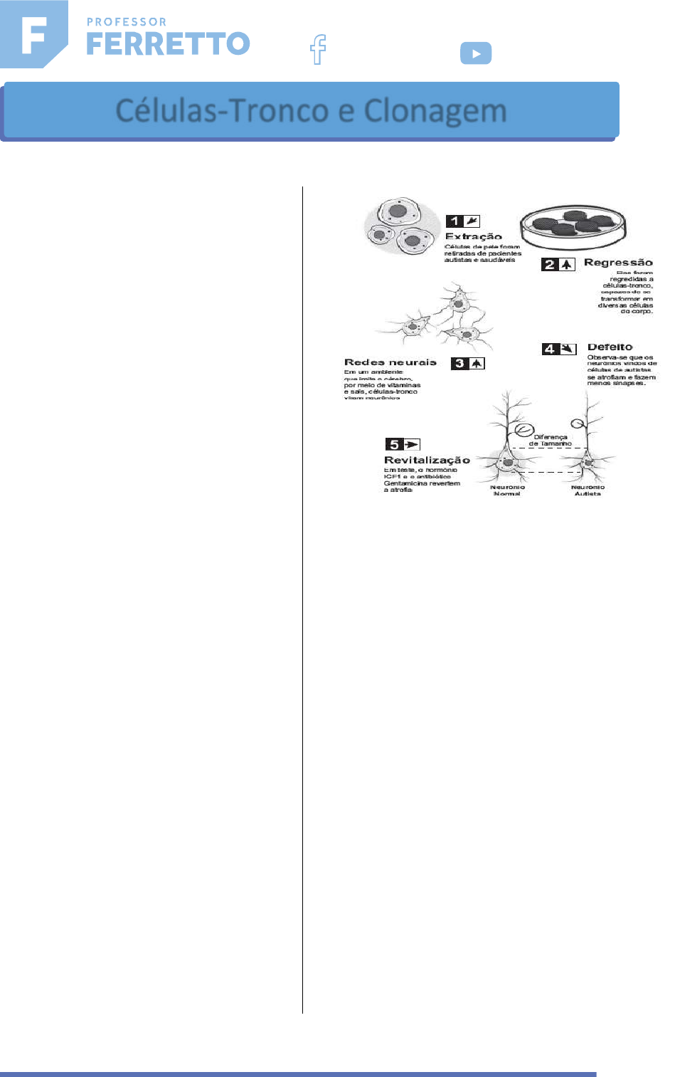 1 01 – (Ufrgs) As células, segundo Bizzozero, são classificadas em lábeis, estáveis e permanentes. As lábeis são pouco diferenciadas e, após cumprirem suas funções, são substituídas. As estáveis são mais diferenciadas e com capacidade de reprodução e regeneração. As permanentes, altamente diferenciadas e com funções muito especializadas, não se reproduzem. A partir dos dados descritos, indicar a alternativa correta que exemplifica, respectivamente, células lábeis, estáveis e permanentes. a) epiteliais, neurônios e hepáticas. b) hepáticas, epiteliais e ósseas. c) neurônios, epiteliais e ósseas. d) sanguíneas, ósseas e nervosas. e) ósseas, hepáticas e nervosas. 02 – (Uece) São células mais diferenciadas e com menor capacidade de reprodução: a) neurônios. b) epiteliais de revestimento. c) hepatócitos. d) fibroblastos. 03 – (Enem) Na década de 1990, células do cordão umbilical de recém-nascidos humanos começaram a ser guardadas por crioperservação, uma vez que apresentam alto potencial terapêutico em consequência de suas características peculiares. O poder terapêutico dessas células baseia-se em sua capacidade de a) Multiplicação lenta. b) Comunicação entre células. c) Adesão a diferentes tecidos. d) Diferenciação em células especializadas. e) Reconhecimento de células semelhantes 04 – (Enem) O estudo do comportamento dos neurônios ao longo de nossa vida pode aumentar a possibilidade de cura do autismo, uma doença genética. A ilustração do experimento mostra a criação de neurônios normais a partir de células da pele de pacientes com autismo: HEIDRICH, G. Disponível em: http://revistagalileu.globo.com. Acesso em: 29 ago. 2011 (adaptado). Analisando-se o experimento, a diferenciação de células-tronco em neurônios ocorre estimulada pela a) extração e utilização de células da pele de um indivíduo portador da doença. b) regressão das células epiteliais a células-tronco em um meio de cultura apropriado. c) atividade genética natural do neurônio autista num meio de cultura semelhante ao cérebro. d) aplicação de um fator de crescimento (hormônio IGF1) e do antibiótico Gentamicina no meio de cultura. e) criação de um meio de cultura de células que imita o cérebro pela utilização de vitaminas e sais minerais. 05 – (Enem) A utilização de células-tronco do próprio indivíduo (autotransplante) tem apresentado sucesso como terapia medicinal para a regeneração de tecidos e órgãos cujas células perdidas não têm capacidade de reprodução, principalmente em substituição aos transplantes, que causam muitos problemas devidos à rejeição pelos receptores. O autotransplante pode causar menos problemas de rejeição quando comparado aos transplantes tradicionais, realizados entre diferentes indivíduos. Isso porque as www.professorferretto.com.br ProfessorFerretto ProfessorFerretto Células-Tronco e Clonagem ee