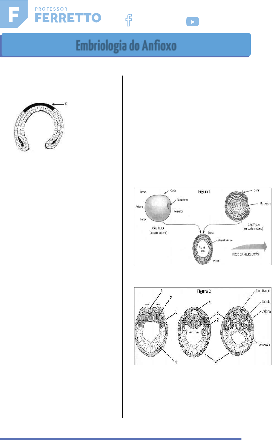 1 01 - (Unifor) O esquema abaixo representa o corte de um embrião em estágio de gástrula. Se um vírus parasitar a região escura (x) haverá alteração na formação do sistema a) digestório. b) reprodutor. c) hormonal. d) respiratório. e) nervoso. 02 - (Uece) Durante o desenvolvimento embrionário dos cordados, a fase na qual se diferencia a notocorda é chamada de a) mórula. b) blástula. c) gástrula. d) nêurula. 03 - (Fcm-jp) O eixo ântero-posterior do embrião nos animais cordados define a formação de duas estruturas cilíndricas, dispostas ao longo do dorso do embrião. Estas estruturas são identificadas como: a) Endoderma e mesoderma. b) Blástula e gástrula. c) Tubo nervoso e notocorda. d) Mórula e Nêurula. e) Blastômero e celoma. 04 - (Uel) Leia o texto a seguir e assinale a alternativa correta. Durante o desenvolvimento embrionário dos humanos, o primeiro indício de formação do sistema nervoso aparece no embrião na fase de: a) Mórula, com o aparecimento do blastóporo. b) Blastocisto, com o aparecimento do tubo neural. c) Blastocisto, com o aparecimento do sulco neural. d) Gástrula, com o aparecimento do arquêntero. e) Gástrula, com o aparecimento da placa neural. 05 - (Ufpb) Observe as figuras abaixo. A figura 1 representa a fase de gastrulação em um embrião de anfioxo, na qual se definem as primeiras etapas de formação de folhetos e do arquêntero. A figura 2 representa, da esquerda para a direita, a continuação do desenvolvimento embrionário deste animal, que é a etapa inicial de sua organogênese. Adaptado de LOPES, Sônia. Bio. v.1. São Paulo, Saraiva, 1997. Adaptado de HILDEBRAND, M. Analysis of vertebrate structure. 3 ed. New York: John Wikey & Sons Inc., 1988. Na figura 2, verifica-se que os números indicados correspondem, respectivamente, às seguintes estruturas: www.professorferretto.com.br ProfessorFerretto ProfessorFerretto Embriologia do Anfioxo ee