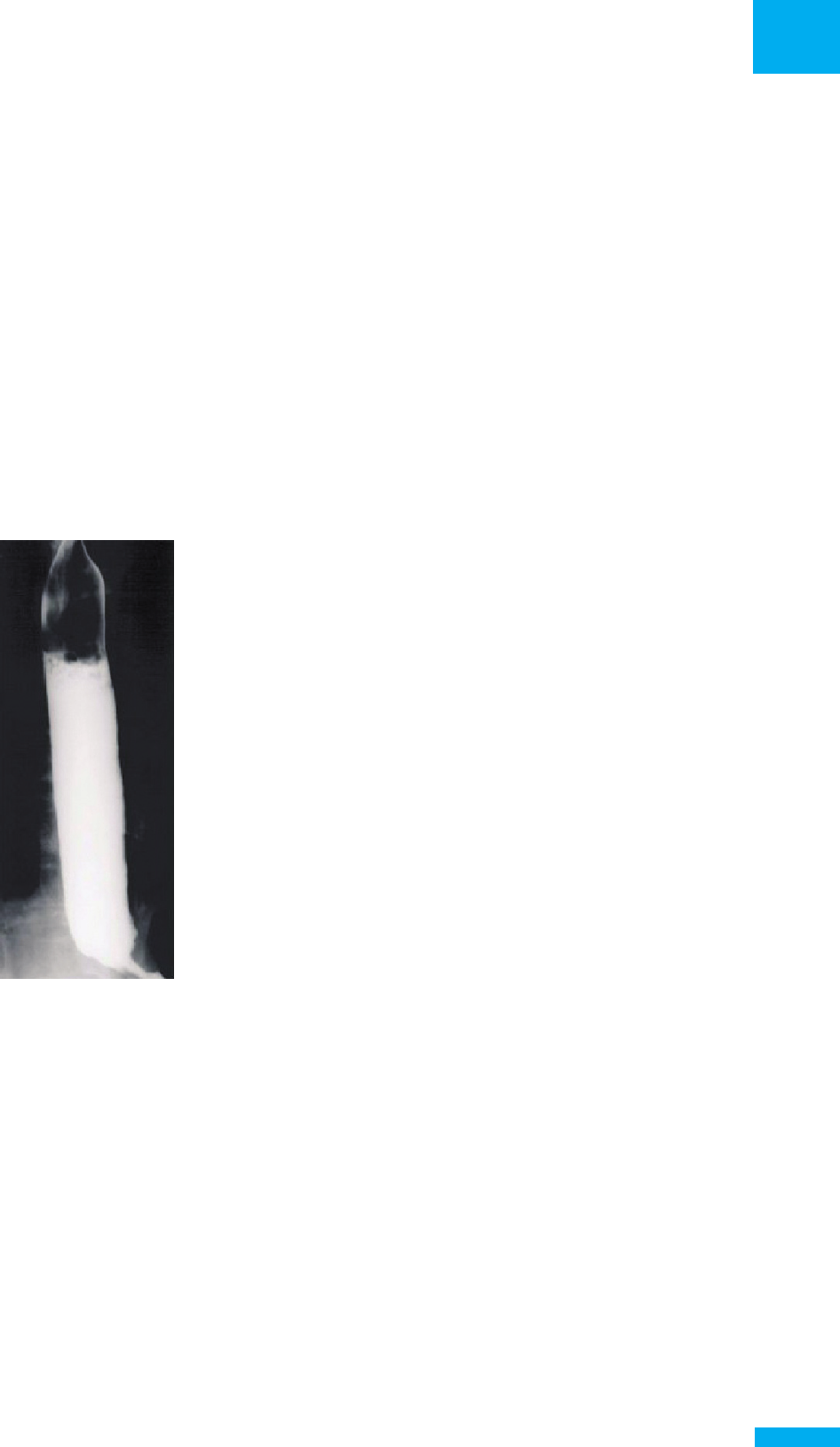 a) muito sintomáticos, conduzindo à regurgitação fre- quente b) portadores de contínua disfagia c) geralmente de colo estreito, causando diverticulite frequente d) sempre cirúrgicos e) assintomáticos e, em regra, não necessitam de trata- mento cirúrgico ACERTEI ERREI DÚVIDA UFG-GO – 2011 109. Um paciente de 58 anos, portador de esofagopatia cha- gásica queixa-se de disfagia a alimentos líquidos e sóli- dos, com piora recente, e perda ponderal. Diz que já fez uso de nifedipina no início da doença, sem melhora ex- pressiva dos sintomas. Atualmente não faz tratamen- to, e procura uma segunda opinião com vistas a outra possibilidade terapêutica. A radiografi a contrastada do esôfago do paciente é ilustrada a seguir. Os princípios do tratamento operatório apropriado a esta situação e os resultados esperados são: a) esofagocardiomiectomia extramucosa com válvula antirrefl uxo, resultando em alívio da disfagia por re- duzir a pressão no esfíncter inferior do esôfago e a sua extensão b) esofagocardiomiectomia extramucosa com válvula antirrefl uxo, resultando em alívio da disfagia por re- duzir a pressão no esfíncter inferior do esôfago, sem interferir na sua extensão c) esofagocardiomiectomia extramucosa sem válvula antirrefl uxo, resultando em alívio da disfagia por re- duzir a extensão do esfíncter inferior do esôfago d) esofagocardiomiectomia extramucosa sem válvula antirrefl uxo, resultando em alívio da disfagia por re- duzir a pressão no esfíncter inferior do esôfago ACERTEI ERREI DÚVIDA UFG-GO – Clínica Cirúrgica – 2011 110. Um paciente é submetido a cardiomiotomia à Heller com confecção de válvula antirrefl uxo à Pinotti e teve boa evolução pós-operatória. Oito anos após a opera- ção passou a apresentar recidiva da disfagia. Qual a provável causa da recidiva? a) miotomia incompleta b) refl uxo gastroesofágico persistente c) válvula antirrefl uxo apertada d) reação tipo corpo estranho aos fi os da cirurgia prévia ACERTEI ERREI DÚVIDA IJF-CE – 2011 111. Qual das opções abaixo descritas NÃO representa um achado encontrado na esofagomanometria de um pa- ciente portador de acalasia? a) aperistalse do corpo esofágico b) ausência ou relaxamento parcial do esfíncter esofa- giano inferior c) pressão do esfíncter esofagiano inferior normal ou > 45 mmHg d) contrações simultâneas não peristálticas ACERTEI ERREI DÚVIDA IJF-CE – 2011 112. São complicações da operação de Heller a longo pra- zo, EXCETO: a) esofagite de refl uxo b) recidiva c) hérnia incisional d) carcinoma epidermoide de esôfago ACERTEI ERREI DÚVIDA IJF-CE – Clínica Cirúrgica – 2011 113. Com relação aos divertículos do esôfago, assinale a alternativa CORRETA: a) o divertículo de Zenker é um divertículo faringoeso- fágico classifi cado como verdadeiro b) o tratamento de escolha para os casos de divertículo de Zenker é a diverticulectomia endoscópica c) os divertículos localizados no esôfago médio são de- nominados de tração e por esse motivo são classifi - cados como falsos d) os divertículos epifrênicos são divertículos de pul- são e geralmente estão associados a distúrbios de motilidade ACERTEI ERREI DÚVIDA Fundação João Goulart – 2011 114. O divertículo de Zenker é o mais comum encontrado no esôfago e tem a seguinte característica etiológica: 14 Anatomia, divertículos, acalasia e temas gerais 145