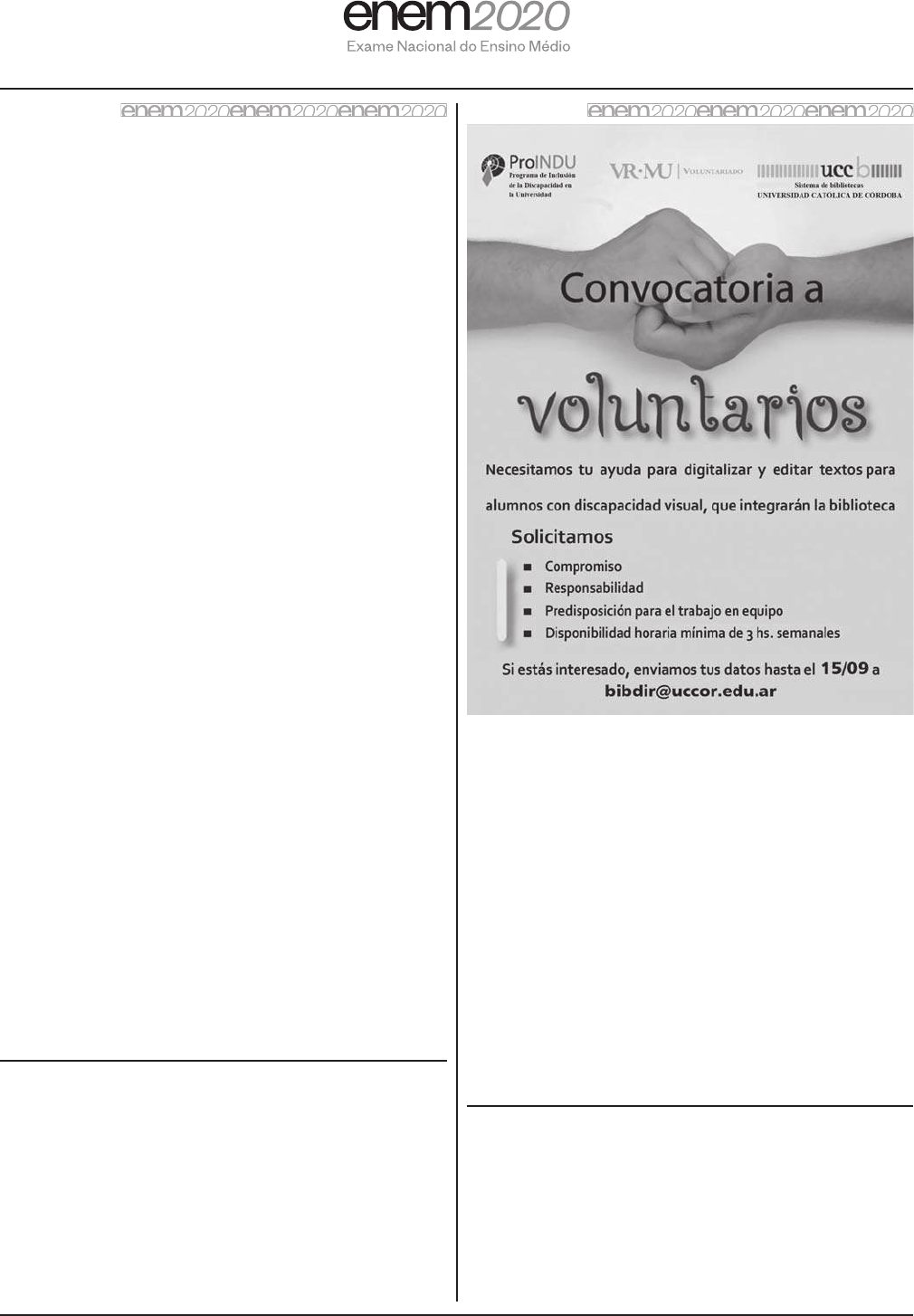 Questão 4 Agosto 9 Día de Los Pueblos Indígenas Rigoberta Menchú nació en Guatemala, cuatro siglos y medio después de la conquista de Pedro de Alvarado y cinco años después de la conquista de Dwight Eisenhower. En 1982, cuando el ejército arrasó las montañas mayas, casi toda la familia de Rigoberta fue exterminada, y fue borrada del mapa la aldea donde su ombligo había sido enterrado para que echara raíz. Diez años después, ella recibió el Premio Nobel de la Paz. Y declaró: — Recibo este premio como un homenaje al pueblo maya, aunque llegue con quinientos años de demora. Los mayas son gente de paciencia. Han sobrevivido a cinco siglos de carnicerías. Ellos saben que el tiempo, como la araña, teje despacio. GALEANO, E. Los hijos de los días. Buenos Aires: Siglo Veintiuno, 2012. A trajetória pessoal de Rigoberta Menchú se confunde com a da própria civilização maia. No texto, ressalta-se como característica desse povo o(a) A trabalho minucioso e incansável para manter sua cultura viva ao longo da história. B tradição de enterrar o umbigo dos recém-nascidos para vinculá-los à terra. C conformismo ao lidar com os eventos traumáticos pelos quais passou. D resistência aos processos de dominação aos quais foi submetido. E busca por reconhecimento após uma história de dificuldades. Questão 5 Disponível em: www.ucc.edu.ar. Acesso em: 4 dez. 2017. Considerando os elementos verbais e não verbais expressos no cartaz, o objetivo do anúncio é A promover o encontro literário entre pessoas com deficiência visual. B divulgar o empréstimo de livros para alunos com dificuldades de acessibilidade. C reivindicar a digitalização do acervo das bibliotecas públicas para leitores cegos. D oferecer a oportunidade de apoio a um projeto para leitores com necessidades especiais. E estimular a arrecadação de livros apropriados para os estudantes com dificuldade de leitura. *010175AZ5* 2ª aplicação LC - 1° dia | Caderno 1 - AZUL - Página 5