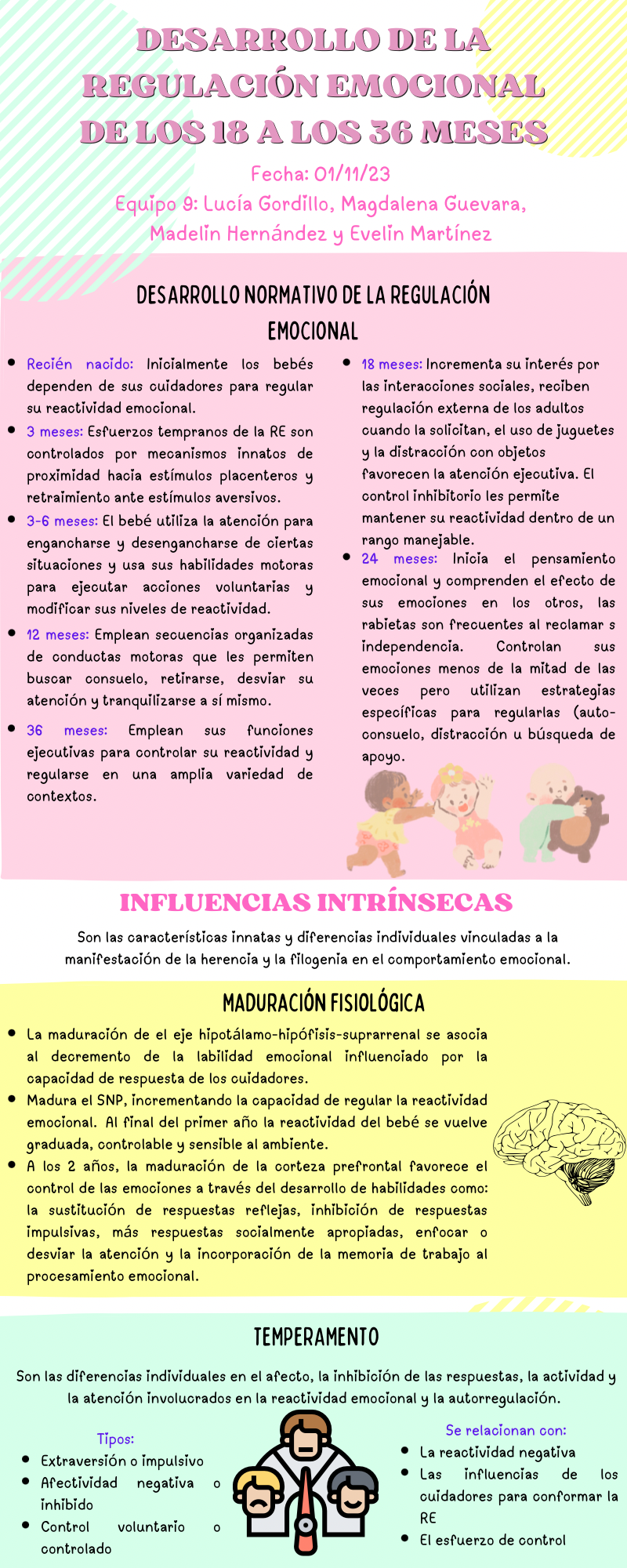 DESARROLLO DE LA REGULACIÓN EMOCIONAL DE LOS 18 A LOS 36 MESES Fecha: 01/11/23 Equipo 9: Lucía Gordillo, Magdalena Guevara, Madelin y Evelin DESARROLLO NORMATIVO DE LA REGULACIÓN EMOCIONAL Recién nacido: Inicialmente los bebés 18 meses: Incrementa su interés por dependen de sus cuidadores para regular las interacciones sociales, reciben su reactividad emocional. regulación externa de los adultos 3 meses: Esfuerzos tempranos de la RE son cuando la solicitan, el uso de juguetes controlados por mecanismos innatos de y la distracción con objetos proximidad hacia estímulos placenteros y favorecen la atención ejecutiva. El retraimiento ante estímulos aversivos. control inhibitorio les permite 3-6 meses: El bebé utiliza la atención para mantener su reactividad dentro de un engancharse y desengancharse de ciertas rango manejable. situaciones y usa sus habilidades motoras 24 meses: Inicia el pensamiento para ejecutar acciones voluntarias y emocional y comprenden el efecto de modificar sus niveles de reactividad. sus emociones en los otros, las rabietas son frecuentes al reclamar S 12 meses: Emplean secuencias organizadas independencia. Controlan sus de conductas motoras que les permiten emociones menos de la mitad de las buscar consuelo, retirarse, desviar su veces pero utilizan estrategias atención y tranquilizarse a sí mismo. específicas para regularlas (auto- 36 meses: Emplean sus funciones consuelo, distracción u búsqueda de ejecutivas para controlar su reactividad y apoyo. regularse en una amplia variedad de contextos. INFLUENCIAS INTRÍNSECAS Son las características innatas y diferencias individuales vinculadas a la manifestación de la herencia y la filogenia en el comportamiento emocional. MADURACIÓN FISIOLÓGICA La maduración de el eje se asocia al decremento de la labilidad emocional influenciado por la capacidad de respuesta de los cuidadores. Madura el SNP, incrementando la capacidad de regular la reactividad emocional. final del primer año la reactividad del bebé se vuelve graduada, controlable y sensible al ambiente. A los 2 años, la maduración de la corteza prefrontal favorece el control de las emociones a través del desarrollo de habilidades como: la sustitución de respuestas reflejas, inhibición de respuestas impulsivas, más respuestas socialmente apropiadas, enfocar o desviar la atención y la incorporación de la memoria de trabajo al procesamiento emocional. TEMPERAMENTO Son las diferencias individuales en el afecto, la inhibición de las respuestas, la actividad y la atención involucrados en la reactividad emocional y la autorregulación. Se relacionan con: Tipos: Extraversión o impulsivo La reactividad negativa Las influencias de los Afectividad negativa inhibido cuidadores para conformar la RE Control voluntario El esfuerzo de control controlado