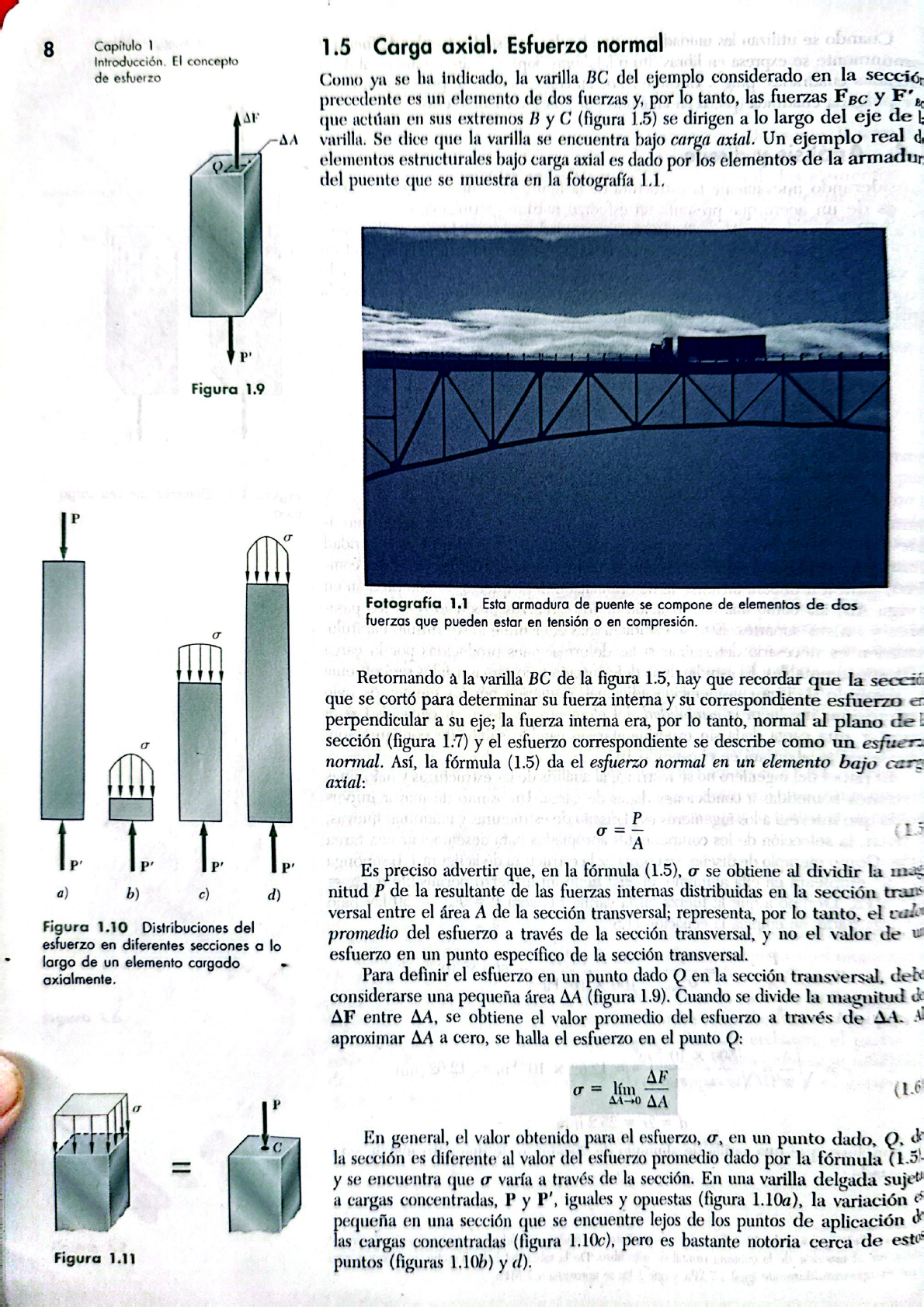 8 Capítulo 1 1.5 Carga axial. Esfuerzo normal El concepto de esfuerzo Como ya se ha indicado, la varilla BC del ejemplo considerado en la sección precedente es un elemento de dos fuerzas y, por lo tanto, las fuerzas FBC y F' AF que actúan en sus extremos B y C (figura 1.5) se dirigen a lo largo del eje de AA varilla. Se dice que la varilla se encuentra bajo carga axial. Un ejemplo real elementos estructurales bajo carga axial es dado por los elementos de la del puente que se muestra en la fotografía 1.1. P' Figura 1.9 Fotografía 1.1 Esta armadura de puente se compone de elementos de dos fuerzas que pueden estar en tensión o en compresión. Retornando à la varilla BC de la figura 1.5, hay que recordar que la que se cortó para determinar su fuerza interna y su correspondiente esfuerzo er perpendicular a su eje; la fuerza interna era, por lo tanto, normal al plano de sección (figura 1.7) y el esfuerzo correspondiente se describe como un normal. Así, la fórmula (1.5) da el esfuerzo normal en un elemento bajo axial: P' P' P' P' Es preciso advertir que, en la fórmula (1.5), o se obtiene al dividir la a) b) c) d) nitud P de la resultante de las fuerzas internas distribuidas en la sección trans versal entre el área A de la sección transversal; representa, por lo tanto, el Figura 1.10 Distribuciones del esfuerzo en diferentes secciones a lo promedio del esfuerzo a través de la sección transversal, y no el valor de largo de un elemento cargado esfuerzo en un punto específico de la sección transversal. axialmente. Para definir el esfuerzo en un punto dado Q en la sección transversal, considerarse una pequeña área AA (figura 1.9). Cuando se divide la magnitud de AF entre AA, se obtiene el valor promedio del esfuerzo a través de AA. aproximar AA a cero, se halla el esfuerzo en el punto Q: AF lím (1.6 P AA-0 AA En general, el valor obtenido para el esfuerzo, en un punto dado, Q, de la sección es diferente al valor del esfuerzo promedio dado por la fórmula (1.5) y se encuentra que o varía a través de la sección. En una varilla delgada a cargas concentradas, P y P', iguales y opuestas (figura 1.10a), la variación pequeña en una sección que se encuentre lejos de los puntos de aplicación las cargas concentradas (figura 1.10c), pero es bastante notoria cerca de Figura 1.11 puntos (figuras 1.10b) y d).De la ecuación (1.6), se deduce que la magnitud de la resultante de las 1.6 Esfuerzo cortante 9 fuerzas internas distribuidas es P No obstante, las condiciones de equilibrio de cada una de las porciones de varilla mostradas en la figura 1.10 requiere que esta magnitud sea igual a la magnitud P de las cargas concentradas. Se tiene, entonces, (1.7) lo que significa que el volumen bajo cada una de las superficies esforzadas en la figura 1.10 debe ser igual a la magnitud P de las cargas. Esto, sin embargo, es la única información que es posible determinar a partir de nuestro conocimiento sobre estática, con respecto a la distribución de los esfuerzos normales en las diversas secciones de la varilla. La distribución real de los esfuerzos en cualquier sección dada es estáticamente indeterminada. Para saber más acerca de esta dis- tribución, es necesario considerar las deformaciones que resultan del modo par- ticular de la aplicación de las cargas en los extremos de la varilla. Esto se explicará P' con mayor atención en el capítulo 2. En la práctica, se supondrá que la distribución de los esfuerzos normales en Figura 1.12 un elemento cargado axialmente es uniforme, excepto en la vecindad inmediata de los puntos de aplicación de las cargas. El valor o del esfuerzo es entonces P igual a y puede calcularse con la fórmula (1.5). Sin embargo, hay que darse cuenta de que, cuando se supone una distribución uniforme de los esfuerzos en la sección, es decir, cuando se supone que las fuerzas internas se encuentran distribuidas uniformemente a través de la sección, la estática dice que la resultante P de las fuerzas internas debe aplicarse en el centroide C de la sección (figura 1.11). Esto significa que una distribución uniforme del esfuerzo es P posible sólo si la línea de acción de las cargas concentradas P P' pasa a través M del centroide de la sección considerada (figura 1.12). Este tipo de carga se deno- mina carga céntrica y se supondrá que tiene lugar en todos los elementos rectos de dos fuerzas que se encuentran en armaduras y en estructuras conectadas con pasadores, como la que se considera en la figura 1.1. Sin embargo, si un elemento con dos fuerzas está cargado de manera axial, pero excéntricamente, como en la figura 1.13a), se encuentra que, a partir de las condiciones de equilibrio de la porción del elemento que se muestra en la figura 1.13b), las fuerzas internas en una sección dada deben ser equivalentes a una fuerza P aplicada al centroide de la sección y a un par M cuyo momento es M = Pd. La distribución de fuerzas -y, por lo tanto, la correspondiente distribución de no puede ser a) b) uniforme. Tampoco la distribución de esfuerzos puede ser simétrica como se muestra en la figura 1.10. Este punto se analizará detalladamente en el capítulo 4. Figura 1.13 Carga axial P 1.6 Esfuerzo cortante Las fuerzas internas y sus correspondientes esfuerzos estudiados en las secciones 1.2 y 1.3, eran normales a la sección considerada. Un tipo muy diferente de A B esfuerzo se obtiene cuando se aplican fuerzas transversales P y P' a un elemento AB (figura 1.14). Al efectuar un corte en C entre los puntos de aplicación de las dos fuerzas (figura 1.15a), obtenemos el diagrama de la porción AC que se mues- tra en la figura 1.15b). Se concluye que deben existir fuerzas internas en el plano de la sección, y que su resultante es igual a P. Estas fuerzas internas elementales se conocen como fuerzas cortantes, y la magnitud P de su resultante es el cortante P' en la sección. Al dividir el cortante P entre el área A de la sección transversal, Figura 1.1