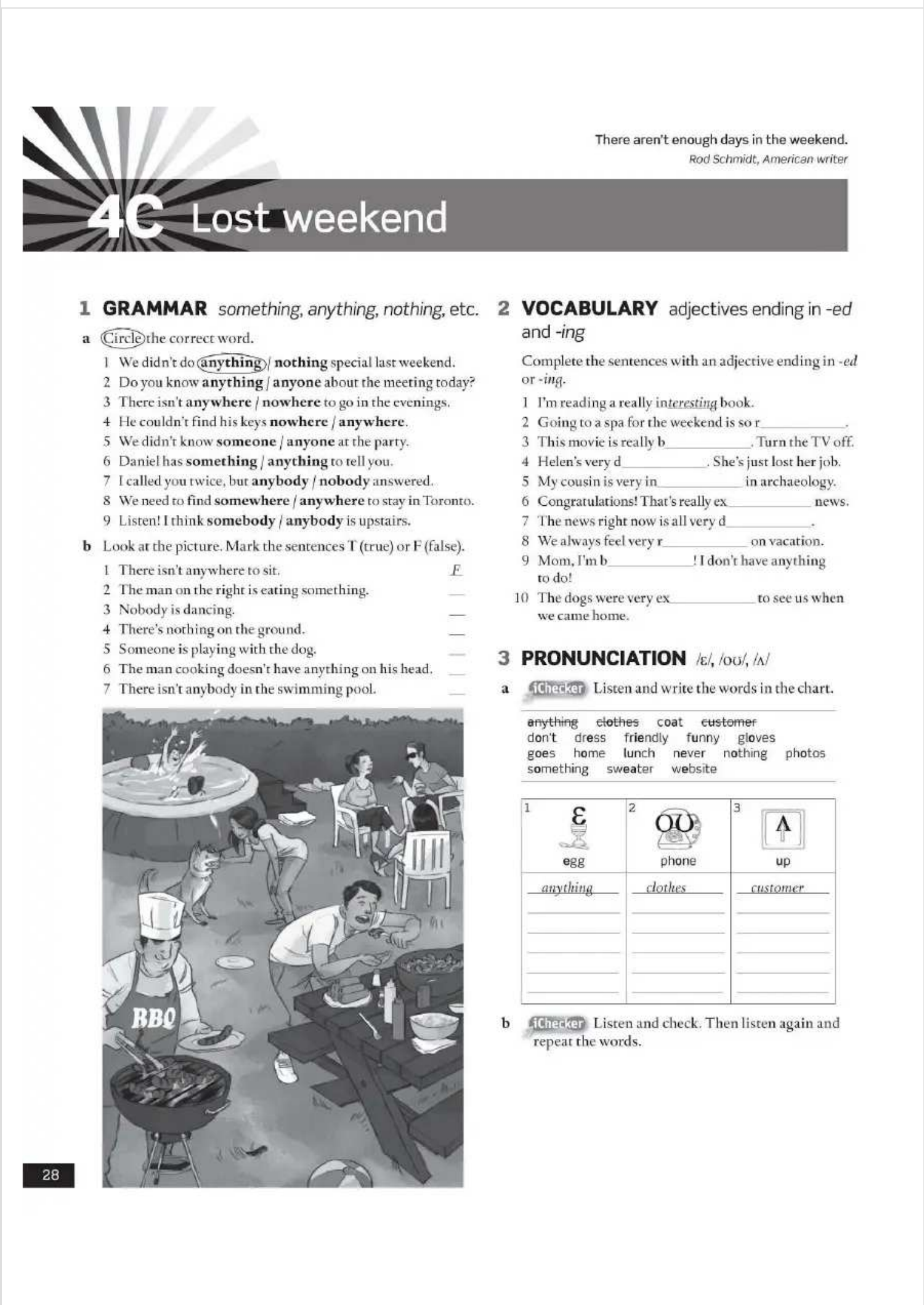 There aren't enough days in the weekend. Rod Schmidt, American writer Lost weekend 1 GRAMMAR something, anything, nothing, etc. 2 VOCABULARY adjectives ending in -ed a Circle the correct word. and -ing We didn't do anything nothing special last weekend. Complete the sentences with an adjective ending in -ed 2 Do you know anything / anyone about the meeting today? or -ing. 3 There isn't anywhere nowhere to go in the evenings. 1 I'm reading a really interesting book. 4 He couldn't find his keys nowhere / any where. 2 Going to a spa for the weekend is 5 We didn't know someone / anyone at the party. 3 This movie is really b Turn the TV off. 6 Daniel has something / anything to you. 4 Helen's very d She's just lost her job. 7 I called you twice, but anybody / nobody 5 My cousin is very in in archaeology. 8 We need to find somewhere any where to stay in Toronto. 6 Congratulations! That's really ex news. 9 Listen! I think somebody / anybody is upstairs. 7 The news right now is all very d b Look at the picture. Mark the sentences T (true) or F (false). 8 We always feel very r on vacation. 9 Mom, I'm b ! don't have anything 1 There isn't any where to sit. F to do! 2 The man on the right is eating something. 10 The dogs were very ex to see us when 3 Nobody is dancing. we came home. 4 There's nothing on the ground. 5 Someone is playing with the dog. 3 PRONUNCIATION /ou/, IN 6 The man cooking doesn't have anything on his head. 7 There isn't anybody in the swimming pool. a iChecker Listen and write the words in the chart. anything clothes coat customer don't dress friendly funny gloves goes home lunch never nothing photos something sweater website 1 2 3 A egg phone up anything clothes customer BBQ b iChecker Listen and check. Then listen again and repeat the words. 28