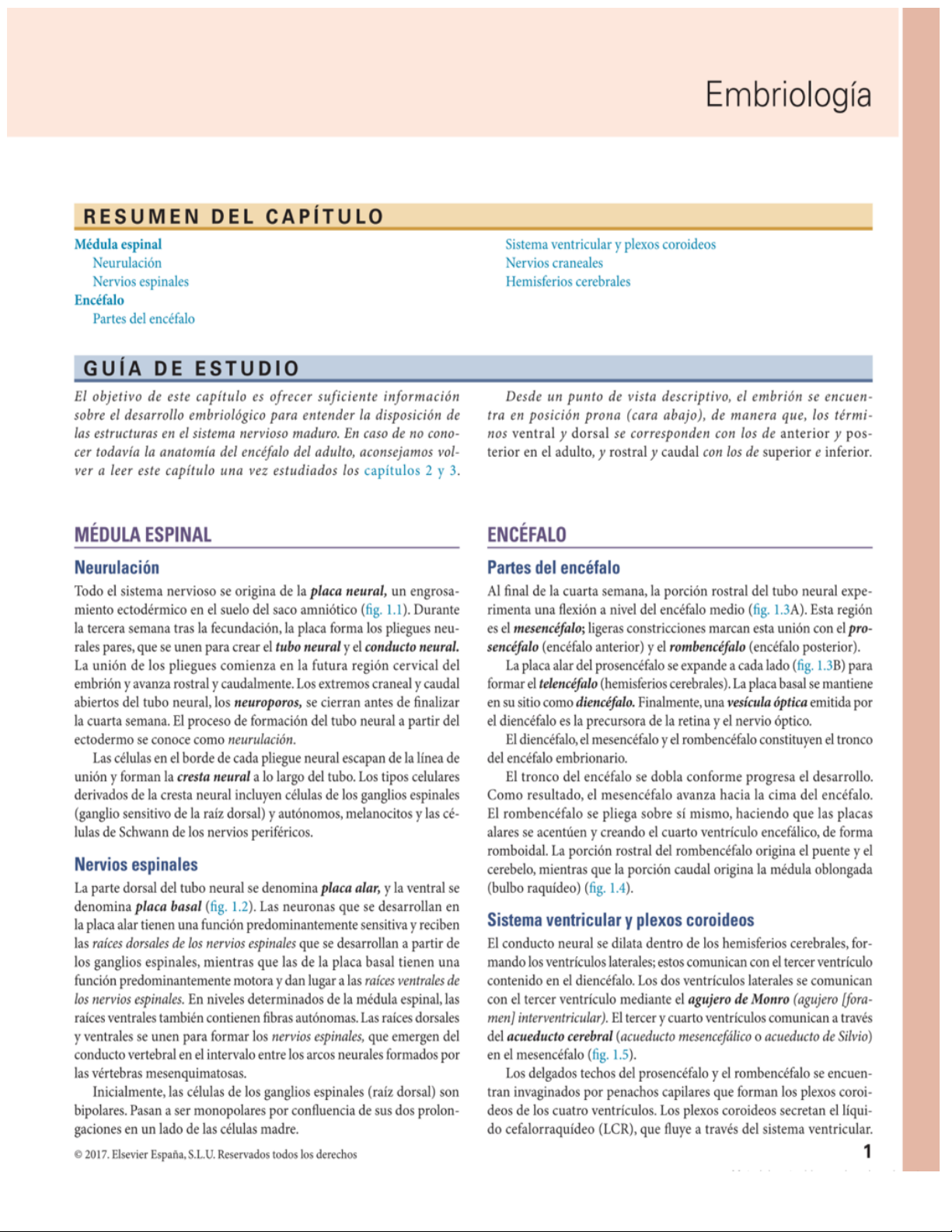 Embriología RESUMEN DEL CAPÍTULO Médula espinal Sistema ventricular y plexos coroideos Neurulación Nervios craneales Nervios espinales Hemisferios cerebrales Encéfalo Partes del encéfalo GUÍA DE ESTUDIO El objetivo de este es ofrecer suficiente información Desde un punto de vista descriptivo, el embrión se encuen- sobre el desarrollo embriológico para entender la disposición de tra en posición prona (cara abajo), de manera que, los térmi- las estructuras en el sistema nervioso maduro. En caso de no cono- nos ventral y dorsal se corresponden con los de anterior y pos- cer todavía la del encéfalo del adulto, aconsejamos vol- terior en el adulto, y rostral y caudal con los de superior e inferior. ver a leer este una vez estudiados los capítulos 2 y 3. MÉDULA ESPINAL ENCÉFALO Neurulación Partes del encéfalo Todo el sistema nervioso se origina de la placa neural, un engrosa- Al final de la cuarta semana, la porción rostral del tubo neural expe- miento ectodérmico en el suelo del saco amniótico (fig. 1.1). Durante rimenta una flexión a nivel del encéfalo medio (fig. 1.3A). Esta región la tercera semana tras la fecundación, la placa forma los pliegues neu- es el mesencéfalo; ligeras constricciones marcan esta unión con el pro- rales pares, que se unen para crear el tubo neural y el conducto neural. sencéfalo (encéfalo anterior) y el rombencéfalo (encéfalo posterior). La unión de los pliegues comienza en la futura región cervical del La placa alar del prosencéfalo se expande a cada lado (fig. 1.3B) para embrión y avanza rostral y caudalmente. Los extremos craneal y caudal formar el telencéfalo (hemisferios cerebrales). La placa basal se mantiene abiertos del tubo neural, los neuroporos, se cierran antes de finalizar en su sitio como diencéfalo. Finalmente, una vesícula óptica emitida por la cuarta semana. El proceso de formación del tubo neural a partir del el diencéfalo es la precursora de la retina y el nervio óptico. ectodermo se conoce como neurulación. El diencéfalo, el mesencéfalo y el rombencéfalo constituyen el tronco Las células en el borde de cada pliegue neural escapan de la línea de del encéfalo embrionario. unión y forman la cresta neural a lo largo del tubo. Los tipos celulares El tronco del encéfalo se dobla conforme progresa el desarrollo. derivados de la cresta neural incluyen células de los ganglios espinales Como resultado, el mesencéfalo avanza hacia la cima del encéfalo. (ganglio sensitivo de la raíz dorsal) y autónomos, melanocitos y las cé- El rombencéfalo se pliega sobre sí mismo, haciendo que las placas lulas de Schwann de los nervios periféricos. alares se acentúen y creando el cuarto ventrículo encefálico, de forma romboidal. La porción rostral del rombencéfalo origina el puente y el Nervios espinales cerebelo, mientras que la porción caudal origina la médula oblongada La parte dorsal del tubo neural se denomina placa alar, y la ventral se (bulbo raquídeo) (fig. 1.4). denomina placa basal (fig. 1.2). Las neuronas que se desarrollan en la placa alar tienen una función predominantemente sensitiva y reciben Sistema ventricular y plexos coroideos las raíces dorsales de los nervios espinales que se desarrollan a partir de El conducto neural se dilata dentro de los hemisferios cerebrales, for- los ganglios espinales, mientras que las de la placa basal tienen una mando los ventrículos laterales; estos comunican con el tercer ventrículo función predominantemente motora y dan lugar a las raíces ventrales de contenido en el diencéfalo. Los dos ventrículos laterales se comunican los nervios espinales. En niveles determinados de la médula espinal, las con el tercer ventrículo mediante el agujero de Monro (agujero [fora- raíces ventrales también contienen fibras autónomas. Las raíces dorsales men] interventricular). El tercer y cuarto ventrículos comunican a través y ventrales se unen para formar los nervios espinales, que emergen del del acueducto cerebral (acueducto mesencefálico o acueducto de Silvio) conducto vertebral en el intervalo entre los arcos neurales formados por en el mesencéfalo (fig. 1.5). las vértebras mesenquimatosas. Los delgados techos del prosencéfalo y el rombencéfalo se encuen- Inicialmente, las células de los ganglios espinales dorsal) son tran invaginados por penachos capilares que forman los plexos coroi- bipolares. Pasan a ser monopolares por confluencia de sus dos prolon- deos de los cuatro ventrículos. Los plexos coroideos secretan el líqui- gaciones en un lado de las células madre. do cefalorraquídeo (LCR), que fluye a través del sistema ventricular. © 2017. Elsevier España, S.L.U. Reservados todos los derechos 1Mesencéfalo Prosencéfalo Placa neural (encéfalo medio) (encéfalo anterior) A A Rombencéfalo (encéfalo posterior) Vesícula óptica Mesodermo Endodermo Cresta neural Pliegue neural Médula espinal A 4 semanas Mesencéfalo (encéfalo medio) Diencéfalo Conducto neural Cuarto ventrículo Pared del Cresta neural tubo neural C Somito Ojo Telencéfalo mesodérmico Notocorda 6 semanas FIGURA 1.1 (A) Sección transversal de un embrión de tres somitos (20 días). (B) y (C) Secciones transversales de un embrión de ocho FIGURA 1.3 (A y B) Vesículas encefálicas, visión desde el lado derecho. somitos (22 días). Los asteriscos indican el lugar de desarrollo inicial del cerebelo. Raíz dorsal Placa alar del nervio espinal Placa basal Ganglio espinal Corteza cerebral Arco neural (ganglio sensitivo Telencéfalo de la raíz dorsal) Cuerpo estriado Prosencéfalo Tálamo Diencéfalo Hipotálamo Mesencéfalo Mesencéfalo Puente Rombencéfalo Cerebelo Médula oblongada FIGURA 1.4 Algunos derivados de las vesículas encefálicas. El LCR abandona el cuarto ventrículo a través de tres aberturas en su techo (fig. 1.6). Nervio espinal Nervios craneales Proceso costal Cuerpo Ganglio autónomo La figura 1.7 ilustra el estado de desarrollo de los nervios craneale