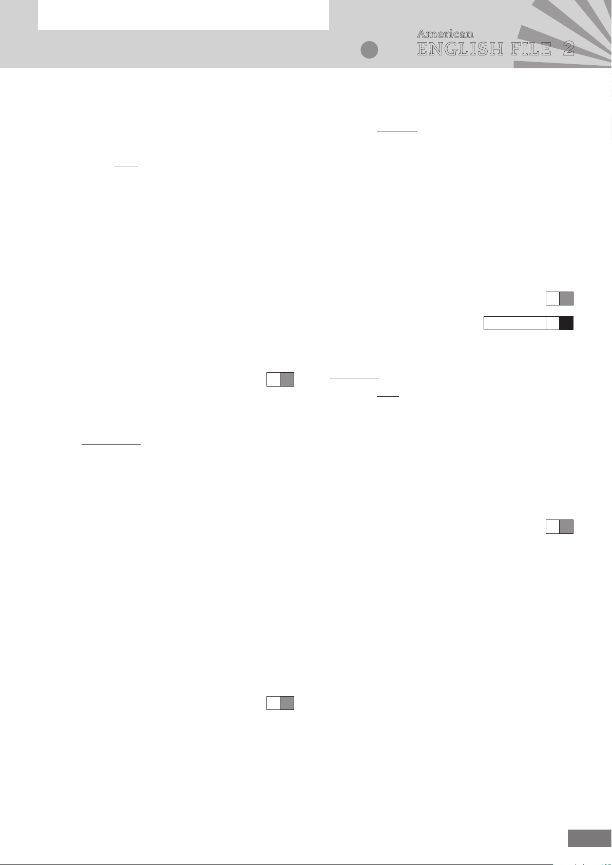 1American English File 2 Photocopiable © Oxford University Press 2013 NAME CLASS 2 Grammar, Vocabulary, and Pronunciation A American ENGLISH FILE 2 3 Complete the sentences with so, because, but, or although. Example: Although it was late, we weren’t tired. 1 Amal doesn’t eat meat __________ he’s a vegetarian. 2 __________ the restaurant was expensive, the food was awful. 3 Tomas doesn’t like his job, __________ he’s looking for another one. 4 It was a nice day, __________ we went to the beach. 5 They’re learning Spanish __________ they want to visit Argentina. 6 I invited John to the party, __________ he didn’t want to come. 6 Grammar total 20 VOCABULARY 4 Underline the correct verb. Example: take / be / have someone to a restaurant 1 meet / run / have across the road 2 have / leave / wait a good time 3 invite / give / eat somebody to dinner 4 wait / meet / drive along the road 5 run / be / play in a hurry 6 wait / run / invite for a friend 7 take / play / give a song 7 GRAMMAR 1 Complete the sentences. Put the verb in parentheses in the past simple or the past continuous. Example: We drove (drive) to Albany last week. 1 It __________ (not snow) when I went to bed. 2 When __________ she __________ (pass) her driving test? 3 Donna __________ (not come) to the theater with us last night. 4 What __________ you __________ (do) at six o’clock last night? 5 I __________ (not study) when you called. 6 Last year they __________ (buy) a new house. 7 We __________ (see) Rachel at the restaurant yesterday. 8 __________ Dan __________ (wear) his suit when you saw him? 8 2 Complete the dialogue. Use the correct form of the verb in parentheses. Lucy Did you enjoy (you enjoy) your trip to Italy? Jean I had a great time! Lucy That’s good. Where 1 __________ (you stay)? Jean In a really nice hotel in Sorrento. Lucy Who 2 __________ (you go) with? Jean Sandy and Mel. We had a few problems while we were there. Lucy What 3 __________ (happen)? Jean Mel lost her passport and her purse. Lucy Really? What 4 __________ (she do)? Jean We went to the police station. Lucy What 5 __________ (they say)? Jean Well – Mel’s things were there! Lucy That was lucky! Who 6 __________ (find) them? Jean Two children – at the beach. Lucy That was very lucky! 6 2American English File 2 Photocopiable © Oxford University Press 2013 NAME CLASS 2 Grammar, Vocabulary, and Pronunciation A American ENGLISH FILE 2 PRONUNCIATION 7 Match the past forms with the same sound. asked argued bought understood started read Example: saw bought 1 rented __________ 2 said __________ 3 dog __________ 4 could __________ 5 tie __________ 5 8 Underline the stressed syllable. Example: friend|ly 1 com|forta|ble 2 in|vite 3 a|part|ment 4 sight|see|ing 5 a|broad 5 Pronunciation total 10 Grammar, Vocabulary, and Pronunciation total 50 5 Complete the sentences with the correct word. Example: She didn’t take many photos when she went to Hong Kong. do have take 1 You need a passport if you want to go __________. by plane on vacation abroad 2 The food at the restaurant was __________. comfortable delicious crowded 3 The weather was lovely. It was __________ every day. foggy cloudy sunny 4 Julie and Andy __________ their flights online. booked hired rented 5 I __________ most of my time at the beach when I’m on vacation. buy go spend 6 Did you __________ any souvenirs when you were in Brazil? buy take have 7 We went __________ for a few days. by car away out 7 6 Complete the sentences with at, in, or on. Example: We got married on May 7th. 1 What did you do __________ the weekend? 2 There was nowhere to sit __________ the train. 3 They played basketball __________ the morning. 4 Stefano was born __________ Rome. 5 They sat __________ the balcony. 6 We arrived __________ the bus stop just before the bus left. 6 Vocabulary total 20 3American English File 2 Photocopiable © Oxford University Press 2013 NAME CLASS American ENGLISH FILE 22 Reading and Writing A 8 The family at the cabin was very nice to the writer. A True ■ B False ■ C Doesn’t say ■ 9 The next day, the writer went skiing in the mountains. A True ■ B False ■ C Doesn’t say ■ 10 The writer wants to go back to the same place. A True ■ B False ■ C Doesn’t say ■ 10 2 Read the article again and answer the questions. 1 How did the writer book the cabin? ___________________________________________ 2 What was the weather like in Vermont? ___________________________________________ 3 What did the writer read at the airport? ___________________________________________ 4 How did the writer go to the cabin? ___________________________________________ 5 How many children were at the cabin? ___________________________________________ 5 Reading total 15 WRITING Write a short essay about a vacation you really enjoyed. Answer these questions. (100–150 words) • Where did you go on vacation? • Who did you go with? • How did you travel? • What activities did you do? • What was the weather like? A vacation I enjoyed I traveled to … Writing total 10 Reading and Writing total 25 READING 1 Read the article from a travel magazine and check (✓) A, B, or C. My vacation disaster Although I work in downtown Philadelphia now, I like going to the mountains when I can. Last winter I decided to spend a week in Vermont. I wanted to go skiing and walking in the mountains. I looked on the Internet and booked a cabin (a small house) for a week. One Friday night last November, I packed my bags, went to Phiadelphia airport, and waited to get on a plane to Burlington. Then the problems started. The plane didn’t leave that night. There was a lot of snow in Vermont and they closed the Burlington airport. So I spent the night at the Philadelphia airport. I drank a lot of coffee and read a lot of newspapers. I tried to sleep, but I wasn’t comfortable. The next morning, Burlington airport opened again, and we arrived in Vermont. But my bags weren’t there. I rented a ca