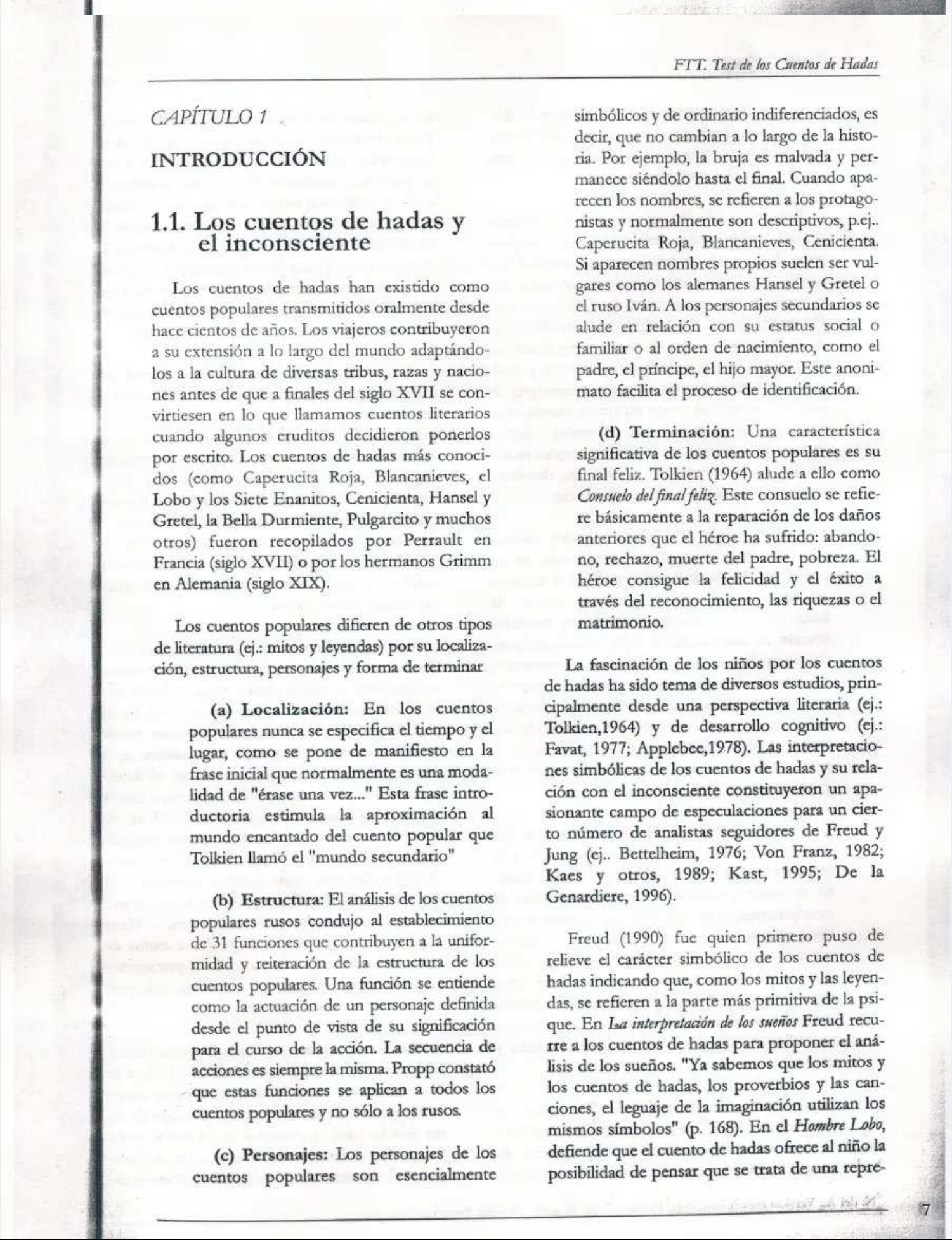 FTT. Test de los Cuentos de Hadas CAPÍTULO 1 simbólicos y de ordinario indiferenciados, es decir, que no cambian a lo largo de la histo- INTRODUCCIÓN ria. Por ejemplo, la bruja es malvada y per- manece siéndolo hasta el final. Cuando apa- recen los nombres, se refieren a los protago- 1.1. Los cuentos de hadas y nistas y normalmente son descriptivos, el inconsciente Caperucita Roja, Blancanieves, Cenicienta. Si aparecen nombres propios suelen ser vul- Los cuentos de hadas han existido como gares como los alemanes Hansel y Gretel cuentos populares transmitidos oralmente desde el ruso Iván. A los personajes secundarios se hace cientos de años. Los viajeros contribuyeron alude en relación con su estatus social a su extensión a lo largo del mundo adaptándo- familiar al orden de nacimiento, como el los a la cultura de diversas tribus, razas y nacio- padre, el príncipe, el hijo mayor. Este anoni- nes antes de que a finales del siglo XVII se con- mato facilita el proceso de identificación. virtiesen en lo que llamamos cuentos literarios cuando algunos eruditos decidieron ponerlos (d) Terminación: Una característica por escrito. Los cuentos de hadas más conoci- significativa de los cuentos populares es su dos (como Caperucita Roja, Blancanieves, el final feliz. Tolkien (1964) alude a ello como Lobo y los Siete Enanitos, Cenicienta, Hansel y Consuelo del final feliz. Este consuelo se refie- Gretel, la Bella Durmiente, Pulgarcito y muchos re básicamente a la reparación de los daños otros) fueron recopilados por Perrault en anteriores que el héroe ha sufrido: abando- Francia (siglo XVII) o por los hermanos Grimm no, rechazo, muerte del padre, pobreza. El en Alemania (siglo XIX). héroe consigue la felicidad y el éxito a través del reconocimiento, las riquezas el Los cuentos populares difieren de otros tipos matrimonio. de literatura (ej.: mitos y leyendas) por su localiza- ción, estructura, personajes y forma de terminar La fascinación de los niños por los cuentos de hadas ha sido tema de diversos estudios, prin- (a) Localización: En los cuentos cipalmente desde una perspectiva literaria (ej.: populares nunca se especifica el tiempo y el Tolkien, y de desarrollo cognitivo (ej.: lugar, como se pone de manifiesto en la Favat, 1977; Applebee,1978). Las interpretacio- frase inicial que normalmente es una moda- nes simbólicas de los cuentos de hadas y su rela- lidad de "érase una vez..." Esta frase intro- ción con el inconsciente constituyeron un apa- ductoria estimula la aproximación al sionante campo de especulaciones para un cier- mundo encantado del cuento popular que to número de analistas seguidores de Freud y Tolkien llamó el "mundo secundario" Jung (ej.. Bettelheim, 1976; Von Franz, 1982; Kaes y otros, 1989; Kast, 1995; De la (b) Estructura: El análisis de los cuentos Genardiere, 1996). populares rusos condujo al establecimiento de 31 funciones que contribuyen a la unifor- Freud (1990) fue quien primero puso de midad y reiteración de la estructura de los relieve el carácter simbólico de los cuentos de cuentos populares. Una función se entiende hadas indicando que, como los mitos y las leyen- como la actuación de un personaje definida das, se refieren a la parte más primitiva de la psi- desde el punto de vista de su significación que. En La interpretación de los sueños Freud recu- para el curso de la acción. La secuencia de rre a los cuentos de hadas para proponer el aná- acciones es siempre la misma. Propp constató lisis de los sueños. "Ya sabemos que los mitos y que estas funciones se aplican a todos los los cuentos de hadas, los proverbios y las can- cuentos populares y no sólo a los rusos. ciones, el leguaje de la imaginación utilizan los mismos símbolos" (p. 168). En el Hombre Lobo, (c) Personajes: Los personajes de los defiende que el cuento de hadas ofrece al niño la cuentos populares son esencialmente posibilidad de pensar que se trata de una repre-Carina sentación de sí mismo. El niño no nota la dife- de las relaciones entre los niños y los cuentos de rencia entre él mismo y el animal, lo que explica hadas poniendo especial énfasis en el valor que no le extrañe que en muchos cuentos apa- terapéutico de éstos en el mundo infantil. Hace rezcan animales antropomorfos. un profundo análisis de los cuentos populares y trata de demostrar cómo cada uno de ellos refle- Roheim (1953) dice que los cuentos de hadas ja conflictos y ansiedades en una etapa específi- recogen experiencias oníricas y que una gran ca del desarrollo. La interpretación analítica de parte de la mitología proviene del mundo de los los cuentos de hadas no está limitada a los cuen- sueños. Probablemente, los cuentos de hadas son tos populares del occidente. Por ejemplo, Doo el producto de sueños contados una y otra vez. Young Cho hizo interpretaciones psicoanalíticas Por eso, según Swartz (1956), el cuento de hadas, de cuentos de hadas coreanos (Cho, 1998). como el sueño, se basa en contrastes y absurdos, es ilógico, tiene significados manifiestos y ocul- Según Shapiro y Katz (1978), Bettelheim tos, utiliza simbolismos, amplía el concepto de interpreta el significado simbólico de los perso- realidad, es una forma de expresión teatral, con- najes en tres niveles: primero, como un persona- tiene elementos sexuales y culturales, expresa je que representa personas importantes en la deseos, tiene formas caprichosas y emplea meca- vida del niño, como sus padres o hermanos; nismos de condensación, sustitución, desplaza- segundo, como representación de una parte miento, devaluación sobre valoración. experimentada de la personalidad (como la parte buena y mala de sí mismo); finalmente como Kaes y otros (1989) indican que los cuentos representación de procesos internos (el Ello, el de hadas están muy próximos al sueño en su Yo y el Superyo). Este tipo de análisis es muy contenido, en su desarrollo y en su utilización similar a la interpretación psicoa