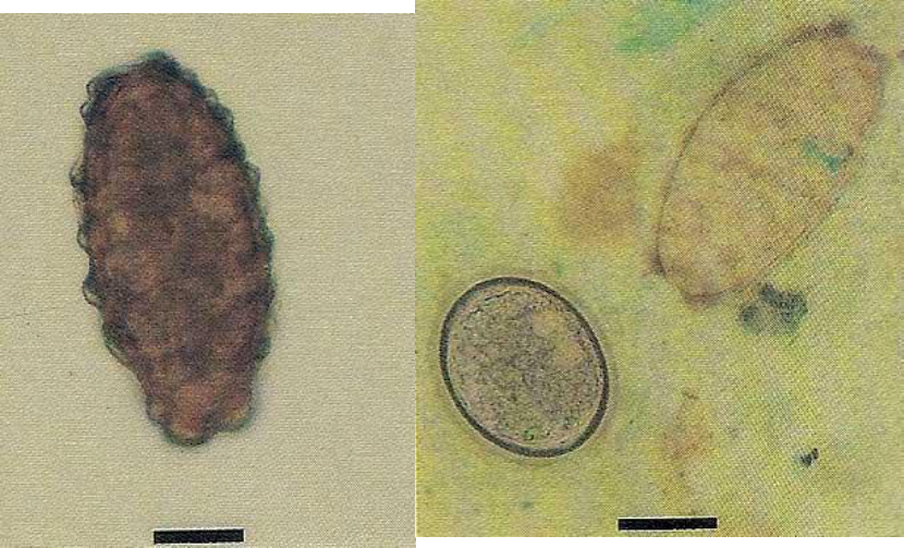 ASCARIASIS DEFINICIÓN Es la infección del intestino delgado por Ascaris lumbricoides, nematodo de mayor tamaño que parasita al hombre de preferencia a los niños Es un geohelminto porque sus huevos maduran en la tierra Ascaris lumbricoides Extremos aguzados, en el anterior la boca triangular con 3 labios dentados. Extremo anterior Ascaris lumbricoides Sistema reproductor muy desarrollado. Tubo digestivo completo Hembra puede poner hasta 240000 huevos diarios. Las hembras no fecundadas: huevos infértiles ( mas largos que los fecundados) Fértil Fértil e infértil MORFOLOGIA ADULTOS gusano cilíndrico de 15 a 35 cm de largo - color rosado nacarado - dimorfismo sexual (macho y hembra) - macho más pequeño, extremo posterior enroscado - hembra de mayor tamaño, extremo posterior recto CICLO EVOLUTIVO - En el ambiente externo los huevos maduran - Se larvan en 3-4 semanas (temperatura, humedad, sombra y suelo) - Se hacen infectantes cuando el huevo está larvado - Ingerido el huevo, se libera la larva en el intestino - Penetra la pared intestinal - Llega a los vasos sanguíneos - Pasa por el hígado - Va al corazón - A los pulmones - Asciende por la vía respiratoria - Llega a la faringe - Es deglutida y se ubica en el intestino delgado HUEVOS - 200.000 huevos al día - microscópicos - color café - aspecto abollonado típico - no son inmediatamente infectantes - la maduración la logran después de su permanencia en la tierra, cuando ésta es contaminada con deposición humana CICLO EVOLUTIVO Ascaris lumbricoides HABITAT Intestino delgado Una vez ubicados en su hábitat definitivo, crecen, maduran sexualmente y empieza la postura de huevos Trancurren 2 a 3 meses desde la ingestión del huevo a la postura de huevos PERIODO PREPATENTE La migración de la larva desde que penetra a la pared intestinal hasta que es deglutida, se ha denominado ciclo de loos PATOLOGIA El parásito al no tener órganos de fijación intestinal no produce daño en la mucosa intestinal Vive en el lumen del intestino delgado donde se mantiene gracias a activos movimientos que neutralizan el peristaltismo intestinal que trata de eliminarlos . Tiene acción expoliatriz y a veces origina complicaciones Daño producido por larvas Ruptura de vasos capilares y alveólos pulmonares al pasar la larva de la vía circulatoria a la vía pulmonar Se producen pequeñas hemorragias Fenómenos de hipersensibilidad con formación de exudados Predominio de eosinófilos asociados a aumento de IgG e IgM Complicaciones Obstrucción intestinal: cuando existe un gran número de parásitos en el intestino. Se forman ovillos. Pueden ser eliminados por la boca por su tendencia a la migración Puede obstruir colédoco, apéndice. Penetrar heridas operatorias y salir al peritoneo SINTOMATOLOGIA En muchos casos no hay manifestaciones clínicas - Cuando se hace evidente, es poco carácterística - En su hábitat normal puede producir complicaciones cuando se conglomeran produciendo obstrucción intestinal - En su paso por los pulmones puede producir síntomas como de una bronquitis, hasta cuadros pulmonares muy severos dependiendo del número de larvas que migran por los pulmones Síntomas generales - anorexia - baja de peso - Síntomas digestivos - dolor abdominal tipo cólico - vómitos - diarrea intermitente - Síntomas nerviosos - irritabilidad - nerviosismo - mal dormir - Sintomas alérgicos - prurito anal - prurito nasal - urticaria Síndrome de Löefler. -eosinofilia -bronconeumonía -ascaridiasis DIAGNOSTICO Clínico y de laboratorio Se debe sospechar en todo cuadro digestivo en pacientes de zona endémica, especialmente centro y sur del país - Evidencia de los huevos del parásito en el examen parasitológico de deposiciones - Sintomatología pulmonar, al migrar la larva por los pulmones Eosinofilia elevada - Radiografía con imágenes de condensación cambiantes en controles sucesivos - Larvas en esputo -Antecedente de eliminación de gusanos por ano o boca EPIDEMIOLOGIA Parasitosis frecuente en zonas húmedas - 5% a 65% en niños, según régimen de agua lluvia caida - Tasas más elevadas en niños que juegan con tierra - Suelos contaminados con deposiciones humanas -Consumo de alimentos, fruta y agua contaminadas PROFILAXIS Comer verduras peladas y cocidas - Aseo de manos de los niños - Buena disposición de excretas