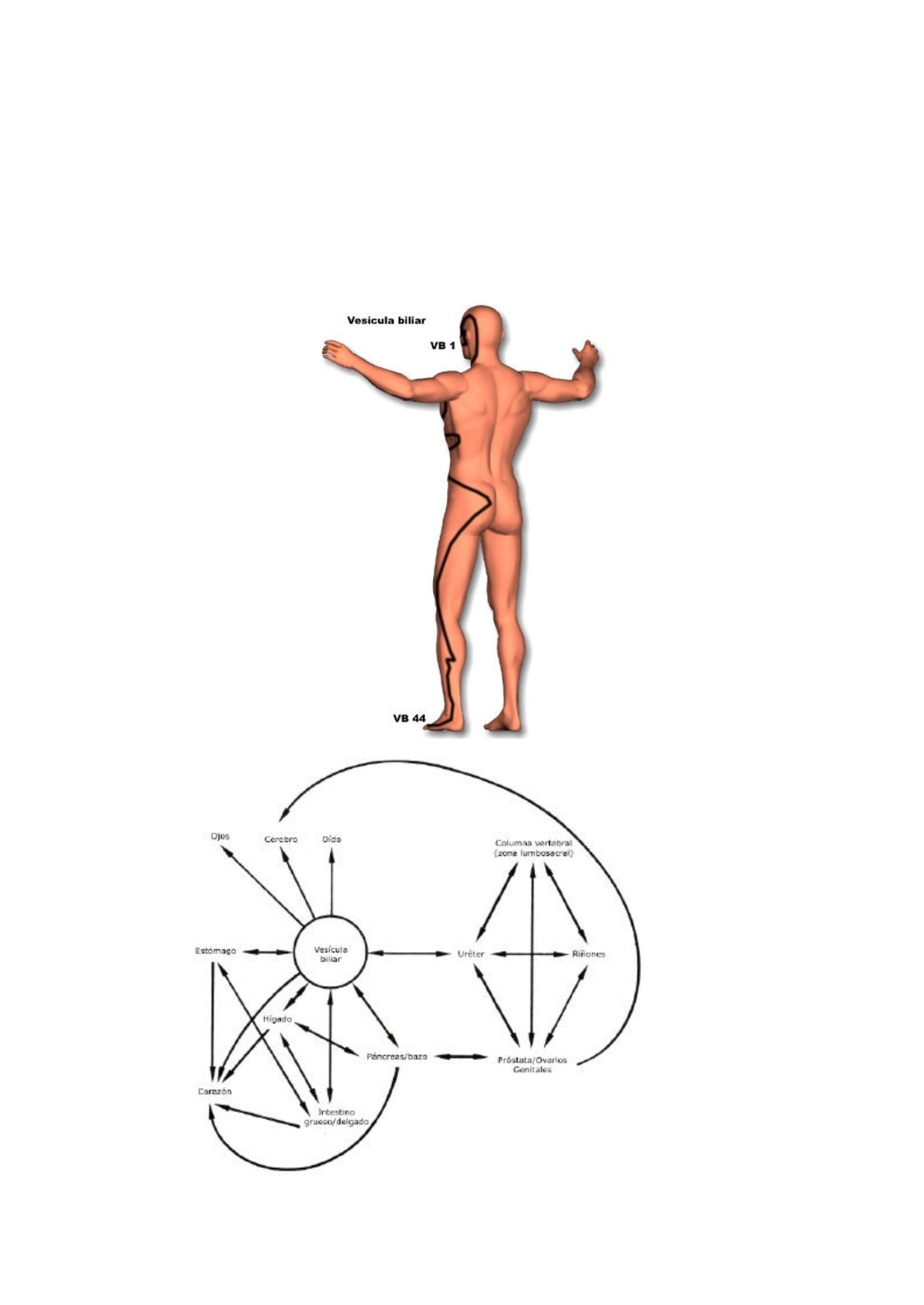 H. Schimmel indica que hay una estrecha relación entre la vesícula biliar y los riñones. La razón de ello puede encontrarse en la teoría de las cinco fases. Cuando el hijo (hígado, vesícula biliar) se vuelve hiperactivo, le roba la energía chi- a la madre (riñones, vejiga). Los riñones y la vejiga se comportan en este caso con el hígado y la vesícula biliar como madre e hijo. Los riñones controlan el sistema reproductivo y urogenital completo, así también la próstata y los ovarios. Ellos son también el “mar de la médula”, lo cual explica la relación de la vesícula biliar con los riñones y la región lumbosacral y con la columna vertebral. Schimmel construye la unión de la vesícula biliar con los riñones y el uréter sobre conexiones fisiológicas. De VB 30 (huantiao), (v. ilustración 17), en la región coxal, el meridiano recorre el lateral del muslo hacia abajo hacia la rodilla y más abajo hasta el cruce lateral de la articulación del pie, antes el maléolo lateral. Continua entonces sobre el empeine del pie y acaba en el cuarto dedo del pie en VB 44, (qiaoyin-pie). Una rama que sale de VB 41 (linqi-pie), hace un recorrido hacia el dedo gordo del pie para producir en H 1 (dadun), la unión con el meridiano del hígado.