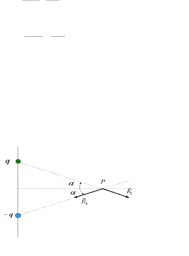 UNNE – Facultad de Ingeniería Física III Ing. Arturo R. Castaño Año 2008 28 de 49 i r q E x rr β πε cos* 4 1 2 2 2 0 2 = en el eje de las X jsen r q E y rr β πε 22 2 0 2 *4 1 = en el eje de las Y Dipolo eléctrico Consideremos ahora un caso especial de distribución de cargas, llamado dipolo el eléctrico, donde tenemos dos cargas q de igual valor, pero de signo contrario. Calcularemos el campo eléctrico E r en la perpendicular bisectriz que une las cargas como se indica en la figura. 21 1 EEEE n i iT rrrr +== ∑ = 021 1 =+==∑ = xExExExE n i iT rrrr EyyEyEyEyE n i iT 221 1 =+==∑ = rrrr por simetría en la figura podemos ver que UNNE – Facultad de Ingeniería Física III Ing. Arturo R. Castaño Año 2008 29 de 49 En consecuencia en campo resultante total es, con dirección del eje Y y apuntando hacia abajo, su magnitud la podemos calcular como θcos*1EEy = θcos2*2 1EEyET == , donde sabemos que 201 * 4 1 x QE πε = , donde el valor de 222 raX += , además de la figura podemos ver que: 22 cos ra a + =θ , reemplazando = ++ == 2222 0 1 **4 1*2cos2 ra a ra QEET πε θ ( ) 23220 2* 4 1 ra aQET + = πε Si consideramos ar >> , podemos simplificar la ecuación y queda 3 0 2* 4 1 r aQET πε ≅ llamamos momento del dipolo eléctrico ρ a aQ2=ρ , de manera tal que la ecuación de campo eléctrico para un dipolo eléctrico para puntos distantes a lo largo de la perpendicular bisectriz queda 3 0 * 4 1 r ET ρ πε = El dipolo esta constituido por dos cargas iguales y opuestas, colocadas muy cercanas entre si, de tal manera que sus campos separados en puntos alejados casi se anulan, pero no totalmente. Desde este punto de vista vemos que la variación ( )rET en un dipolo varía proporcionalmente a ( ) 31rrET ∝ , mientras que para una carga puntual ( )rET varia más lentamente , puesto que es proporcional a ( ) 21rrET ∝