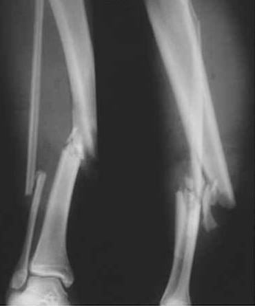 Após um acidente automobilístico um indivíduo sofreu fratura nos ossos da perna. Observe a radiografia abaixo, indicando a localização da fratura.