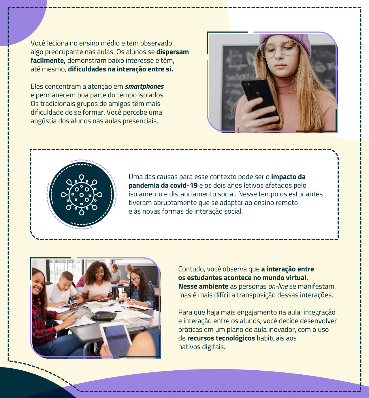 Nessa proposta, o aluno deve ser convidado a atuar em sala de aula, a exercer autonomia em seu processo de ensino e aprendizagem e também a fortalecer os laços sociais com os colegas. Porém, não se trata de uma atividade apenas, mas de um modelo que pode ser aplicado ao seu plano de aulas, guiando-as ao longo do ano ou semestre letivo.
