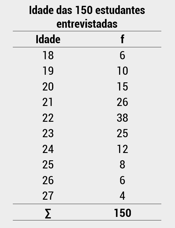 Em um estudo, você entrevistou 150 mulheres estudantes da área da saúde e perguntou sobre a idade, obtendo as seguintes informações: