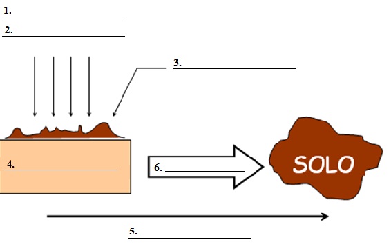 1. Precipitação; 2. Temperatura; 3. Relevo; 4. Rocha parental; 5. Tempo; 6. Intemperismo.