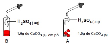 Portanto, a velocidade de reação e, consequentemente, a liberação do gás carbônico no tubo B é mais rápida, pois a superfície de contato dos reagentes é maior.